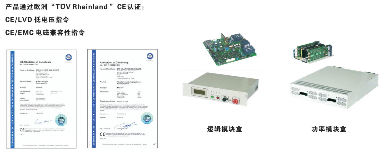 MPA系列功率放大器是采用正弦脈沖寬度調制技術的數字式功率放大器。其工作原理是:利用MOSFET場效應管的高頻開關能力,將控制儀輸入的低電壓信號通過數字電路進行放大并還原成原信號,然后將其輸出至電動振動臺的動圈線路,推動電動振動臺臺面運動。數字式功率放大器的主要組成部分:邏輯模塊盒,功放模塊盒,保護電路,勵磁電源部分和電柜。 MPA功率放大器的輸出范圍為1kVA~1000kVA。系統技術指標完全適用于現有的或新的風冷或水冷型電動振動臺。可用于替換其他廠商同型號的功率放大器。 MPA 系列功率放大器是采用新技術設計的寬頻帶數字開關功率放大器,主要有邏輯模塊、功率模塊、勵磁電源模塊等組成。MPA 系列功率放大器功率器件均采用美國知名公司供貨,質量有保證。 MPA系列功率放大器產品通過歐洲“TUV Rheinland”CE認證.